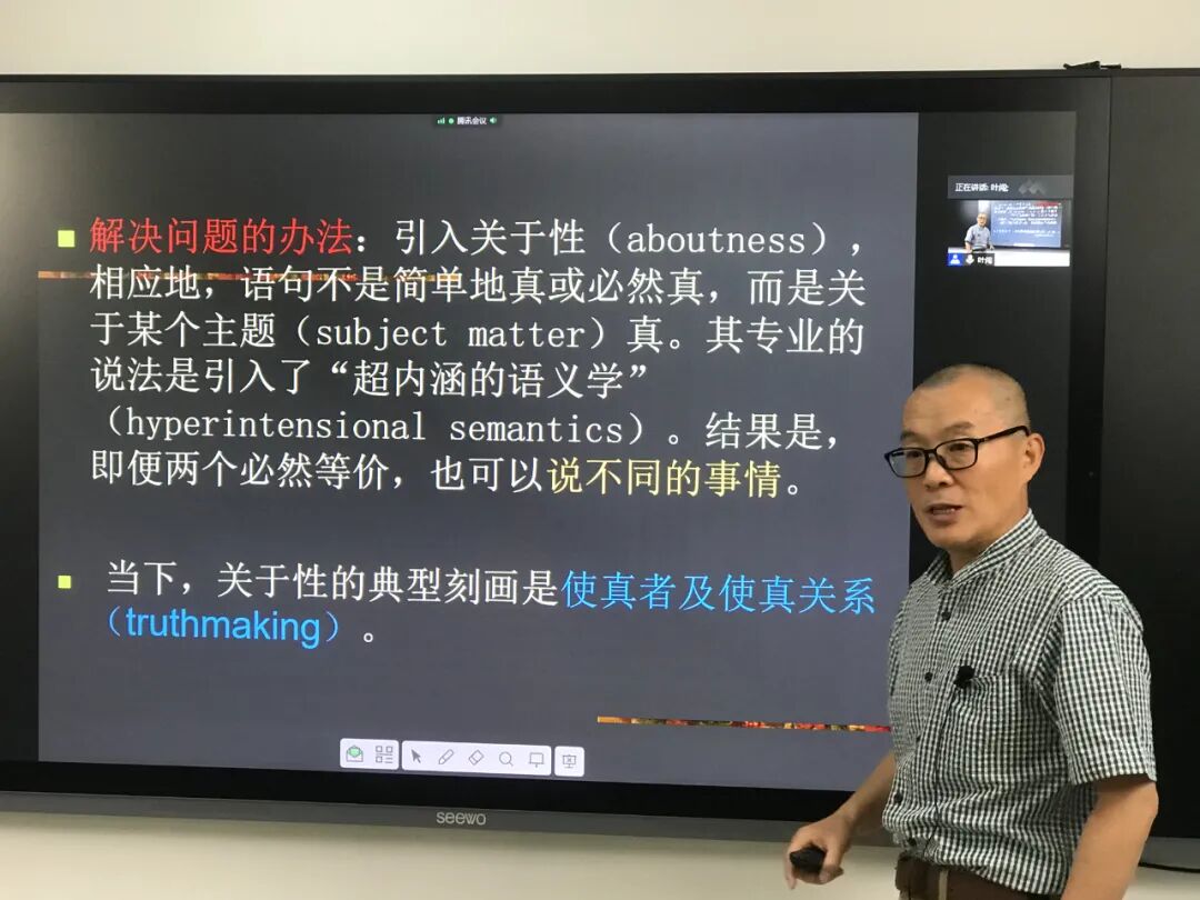 北京大学外国哲学研究所、哲学系教授叶闯老师主讲“从语言的角度看世界与从世界的角度看语言”。叶老师首先通过几个直观的例子表明,真语句与世界之间的关系远比人们通常设想的要复杂。在此之后,他介绍了当代语言哲学前沿的两个重要概念:关于性(aboutness)和使真者(truth-maker)。前者涉及“从语言的角度看世界”:传统的语言哲学中,人们一般满足于用“必然真”的概念来刻画命题内容的同一性,但这种刻画方式在语义学、逻辑学、伦理学、认识论和心灵哲学等领域中会产生许多不合理的理论后果。通过引入“关于性”概念,人们有望解决这些问题。“使真者”的概念则涉及“从世界的角度看语言”:这里的问题是,有一些真语句(如关于抽象对象或理论事物的语句以及否定存在句等),其之所以为真,似乎无法用世界中任何事物来加以说明。如何解决这类语句的“使真者”问题?叶老师指出形而上学奠基与本质主义是两种当前较为流行的策略。